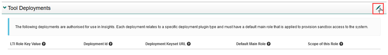 - While still on the External LTI Platform Settings editable screen, select the Edit icon next to the Tool Deployments expandable section.