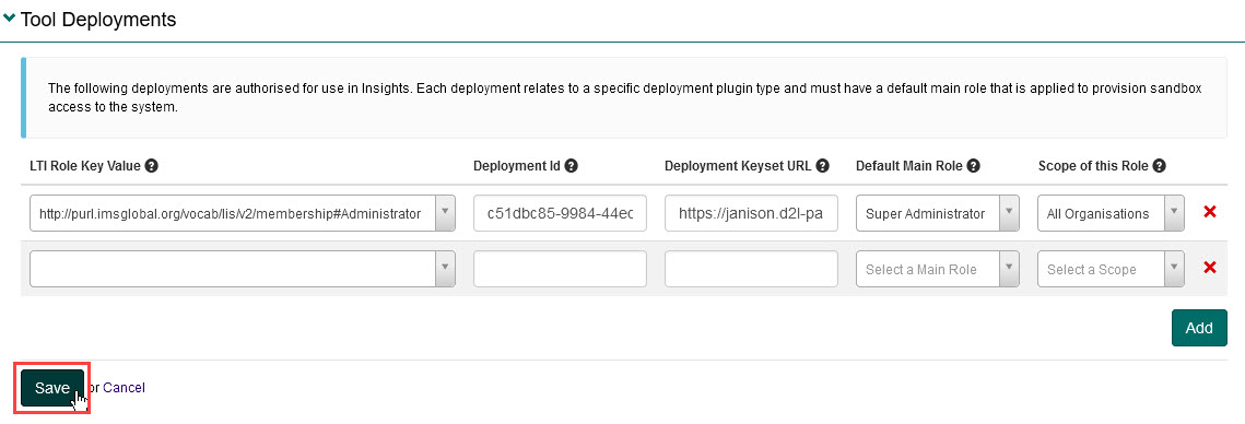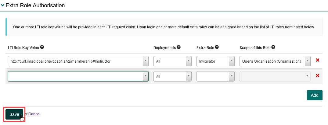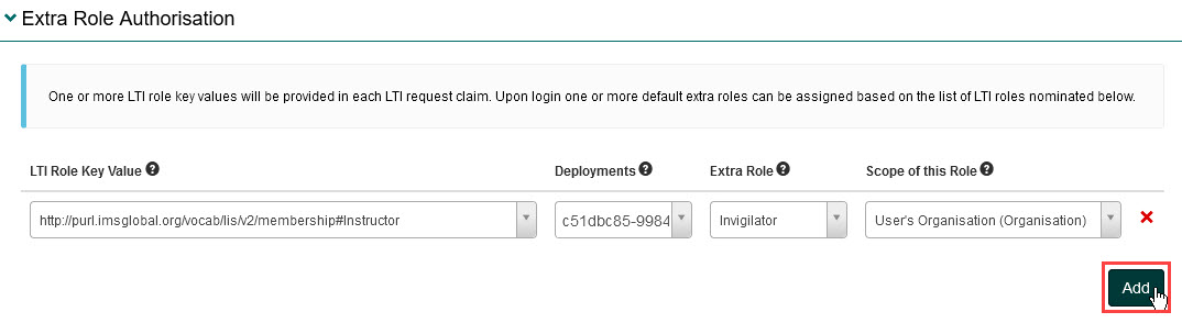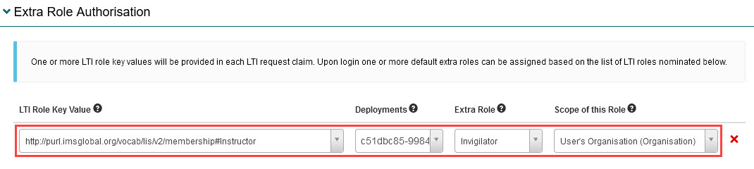 For example, if you have set the LTI Instructor role to be Test Manager by default in Janison Insights but you also want to the Instructor role to be assigned Invigilator in Janison Insights, you will need to add the extra role here.