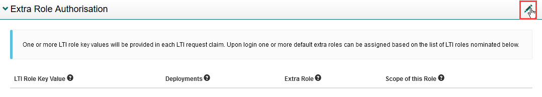 - While still on the External LTI Platform Settings editable screen, select the Edit icon next to the Extra Role Authorisation expandable section.