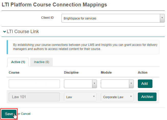 You now need to create LTI platform course connection mappings between Brightspace and Insights. These are used to grant access for Delivery Managers and Authors to access content related to their course.