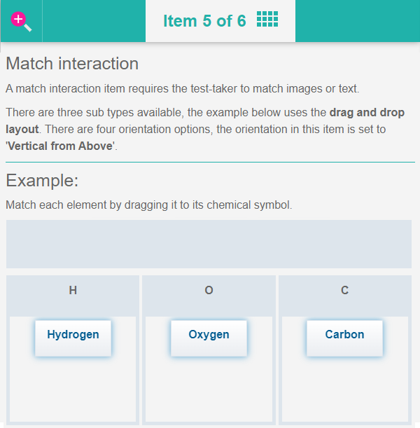A match interaction item requires the test-taker to match related images or text. There are three sub-types of this item, each sub-typed displays the item to the test-taker differently. The sub -types are ‘drag and drop’, ‘checkbox’ and ‘draw lines’.