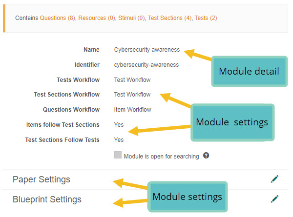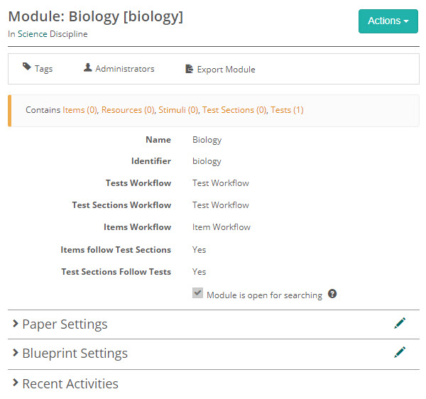 Once saved, the module details screen displays. Additional sections are available for configuration, but these may differ depending on the configuration of your site. In the below example Paper Settings and Blueprint Settings sections display.