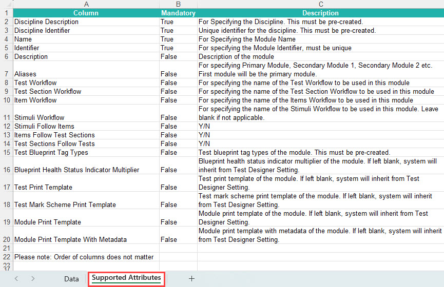 The template includes sample data. Visit the Supported Attributes tab to review mandatory fields and explanations for each field.
