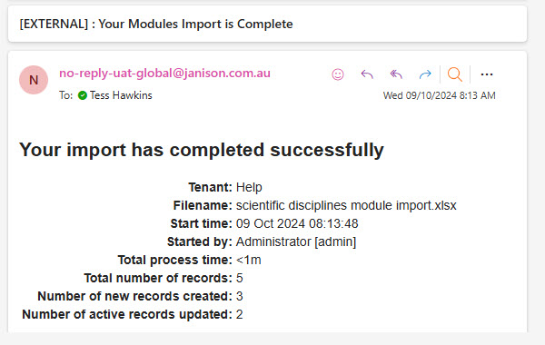 The system will email you the import details. Below is an example of a successful import. If the import fails, the reasons will be listed.