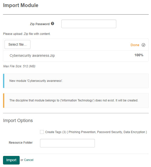 During the first import, the module’s items, resources, stimuli and tests are created. If the module, discipline, and tags don’t exist, they will be created. Creating the tags is optional.