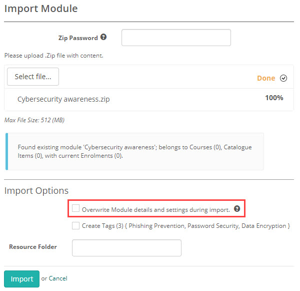 If you have previously imported the module, the module’s items, resources, stimuli and tests will be updated.