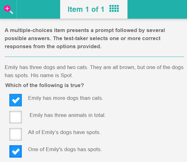 A multiple-choices item presents a question followed by several possible answers. The test-taker selects one or more correct responses from the options provided. It differs from a multiple choice item which has just one correct answer.