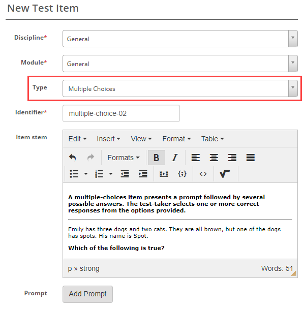 Select Multiple Choices as the item type and enter the Item stem.