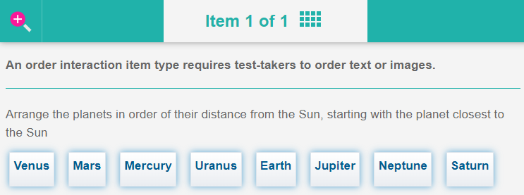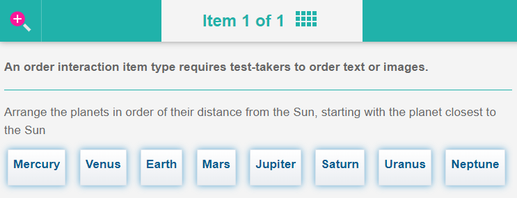 Order interaction item types are a similar concept to graphic order interaction item types, where test-takers drag and drop numbers onto designated hotspots on an image to indicate the correct order.
