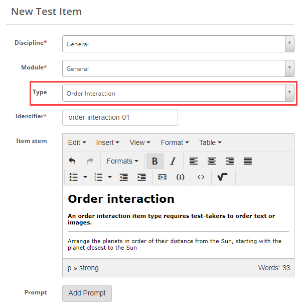 Select Order Interaction as the item type and enter the Item stem.
