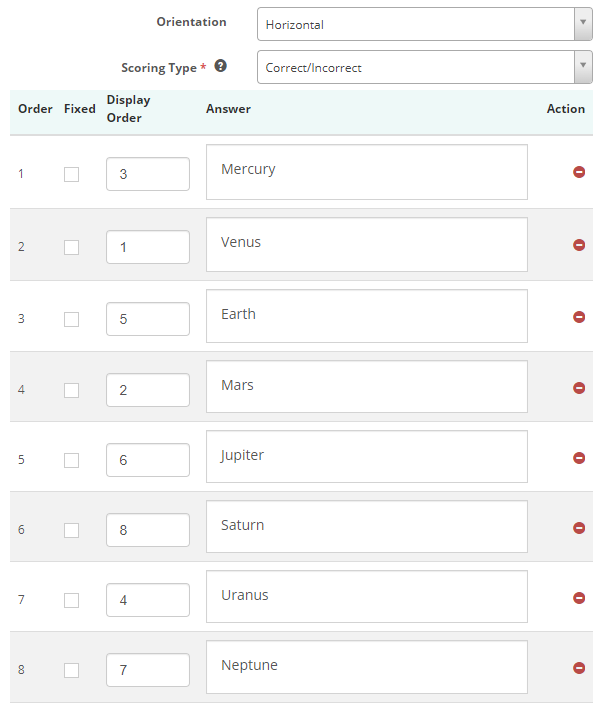 Enter the answers in the correct order in the Answers field. Next, enter the order in which the options should display to the test-takers in the Display Order column. The Order column displays the correct sequence of the answers.