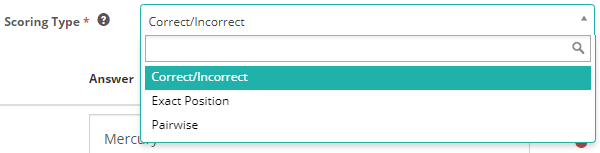 Scoring Type – The options are Correct/Incorrect, Exact Position and Pairwise. See the Setting scores and marking below to learn more about these options.