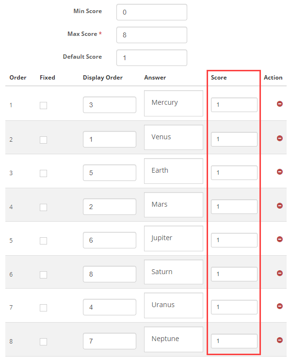 With exact position and pairwise scoring type, additional scoring options will become available to the item author, allowing them to add a score for each response.