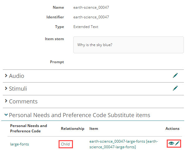 In this example, the parent item is earth-science_00047 and the substitute item earth-science_00047-large fonts.