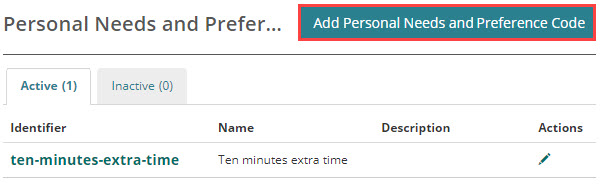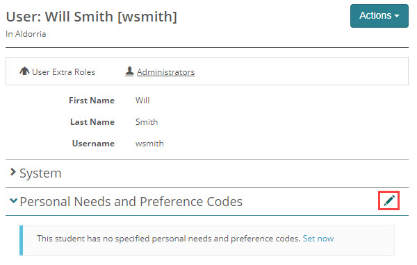 Open the test-taker profile and select the pencil icon on the Personal Needs and Preference Codes expandible.