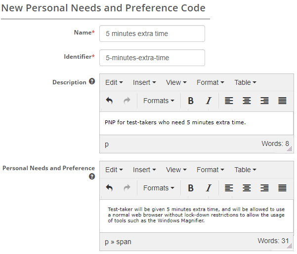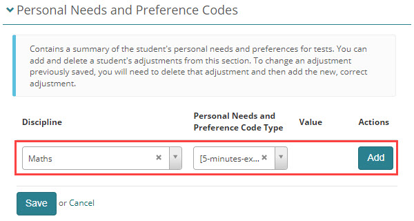 Once activated, a new section displays on the test-taker’s profile where administrators can add PNPs.
