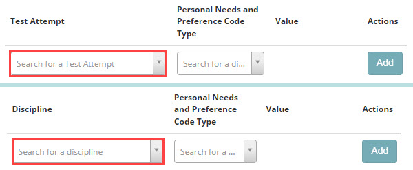 You can either link the PNPs to test-takers at the discipline or at the attempt level. If you link PNPs at the discipline level, the PNP will apply to all tests in that discipline. If you link them at the attempt level, the PNP will only apply to the attempt.