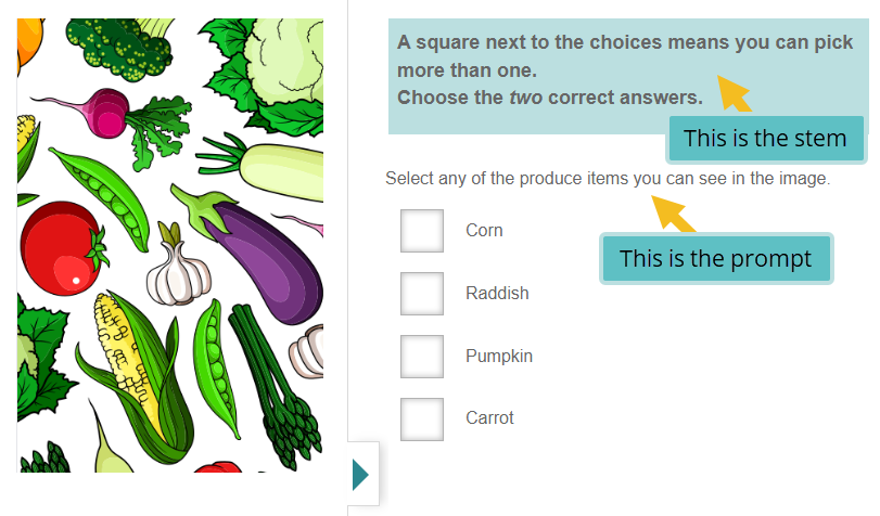 In the example below, the stem is at the top and the prompt just under the stem. If an author entered both blocks of this text into the stem, the item would display to the test-taker exactly the same.