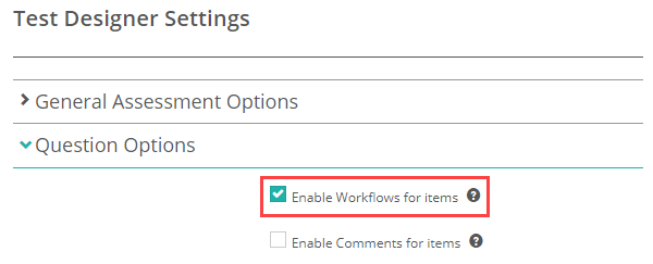 To enable workflows on items, go to Settings > Test Designer Settings and expand the Question Options section.
