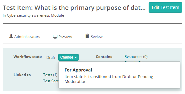 The workflow system ensures a structured quality control process for item creation. For a basic workflow, an item begins in draft mode, where it can be developed and edited. Once complete, the author transitions it to for approval for feedback and adjustments. Finally, the authoring manager transitions the item to the approved state, where it is locked from further edits. Items can move forward and backward between these stages as needed, but once published, editing is restricted to ensure content integrity and readiness for use.