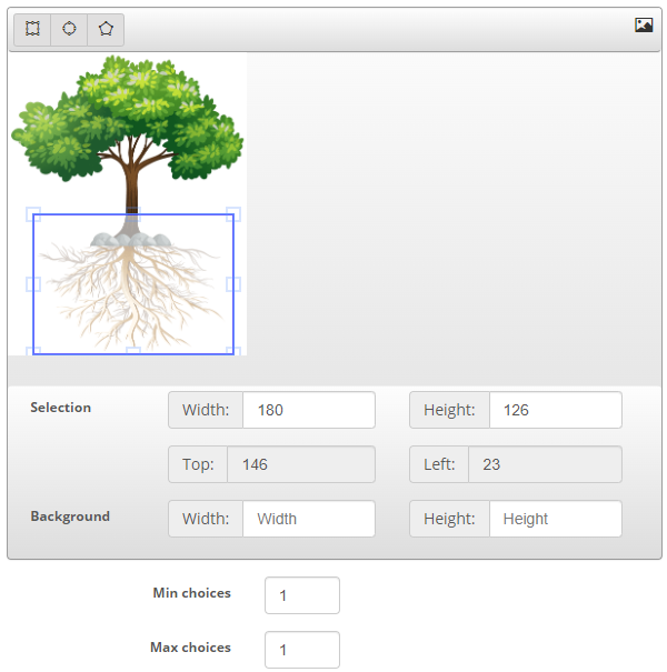 Max Choices – Enter the maximum number of matches for each item in the Max Choices fields. If you set match max to ‘1’, the test-taker can only select one area on the image. If set to 2, they can select two areas.