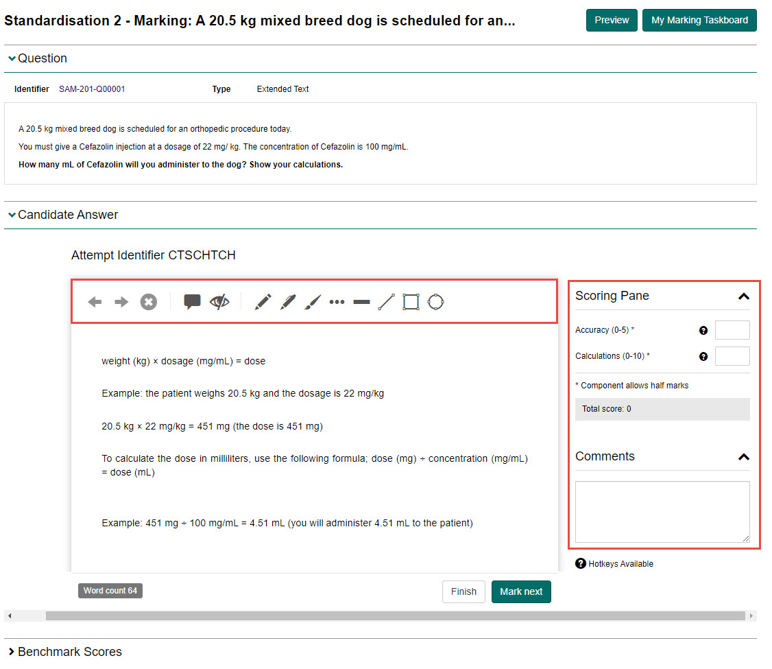 The Marking screen displays. The Marker Scores expandable section displays the different scores given by the Markers.