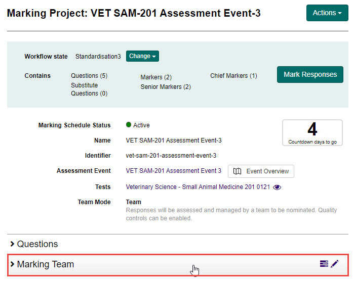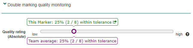 The Double marking quality monitoring expandable section displays the Quality Rating (Absolute) which is the percentage of times that this marker’s score exceeded the double marking tolerance. It is useful to compare how often this happens on average within the team. Markers that disagree substantially more than the team average may require closer monitoring.
