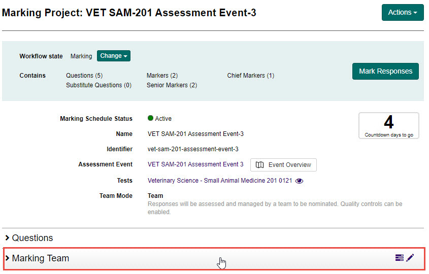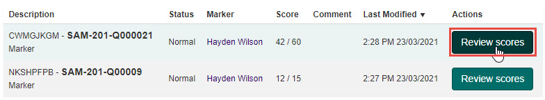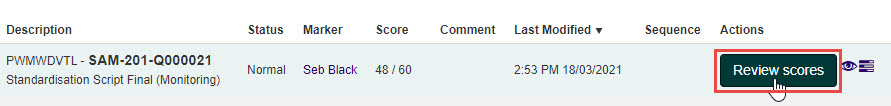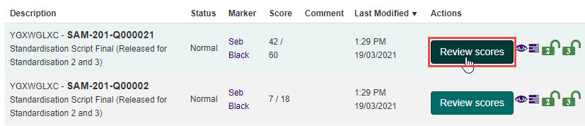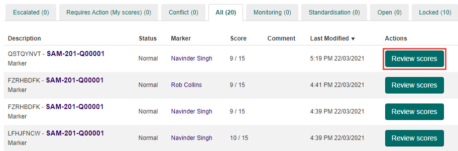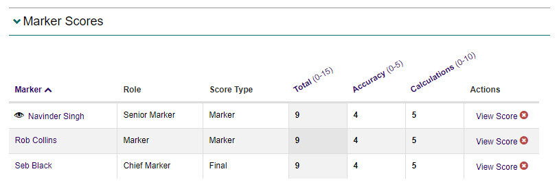 The Marker Scores section contains the marking progress for all Markers involved with the question.