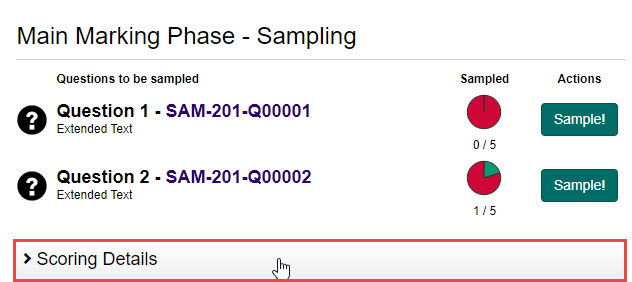 The Sampling expandable section shows the Agreement with senior marker sample. This quality rating indicates the percentage of time a Senior Marker’s score (during sampling) is different to what the Marker originally scored.