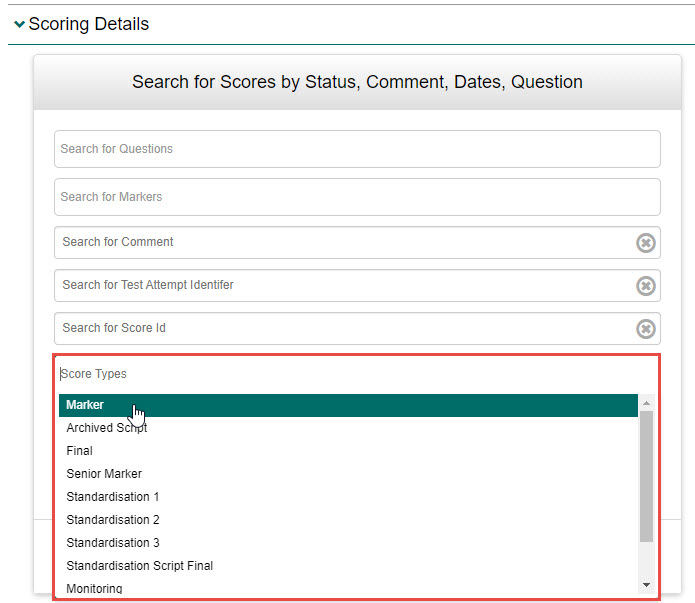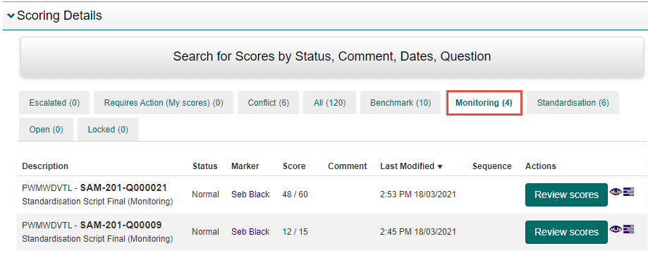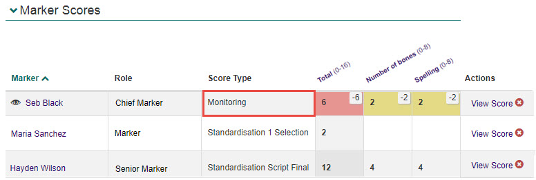 The Marker Scores section contains the marking progress for all Markers involved with the question. You can identify the monitoring scores in the Score Type column.