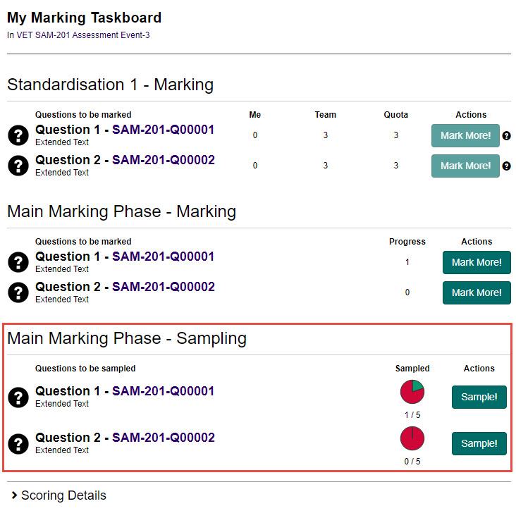 During the marking phase, a section called Main Marking Phase – Sampling displays on the My Marking Taskboard screen. This is where you can review marked responses to ensure consistency and Marker accuracy.