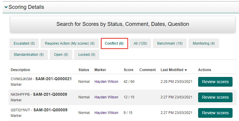 Senior Markers can monitor conflicts from the Marking Output section of the Marker Profile.