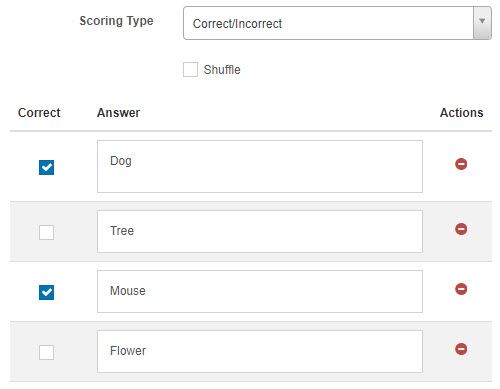 | Correct/Incorrect | If this option is chosen, the candidate must select all correct responses and no incorrect answers to get the question correct. For example, in this multiple choices question, there are two correct answers. If the candidate selects both of the correct options, they will get the question correct. If they select any other combination, they will get the question incorrect. ![]() |