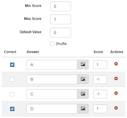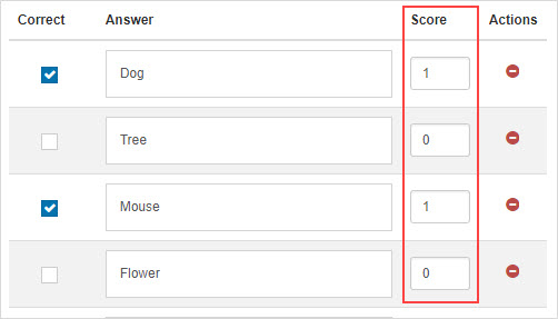 | Per distractor | If this option is chosen, an additional Score column will appear to the question author, allowing them to add a score for each response. For example, a candidate can score 0, 1 or 2 marks. ![]() |