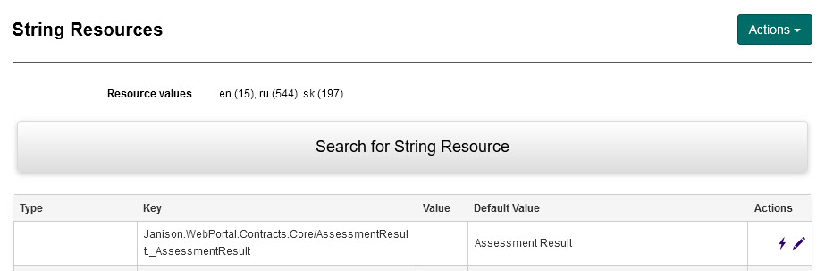 On the String Resources screen, you can also select tasks to perform from the Actions drop-down. See the Complete actions on multiple string resources and Export/import string resources section for more information on these tasks.