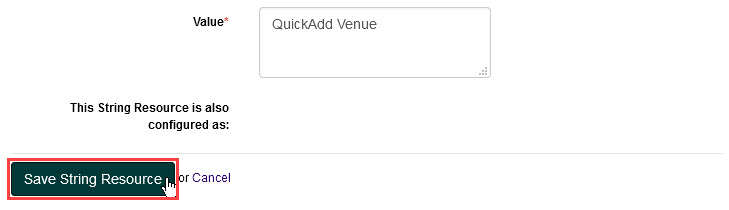 - If the string resource already has a customised value, the Edit String Resource screen displays. This screen shows the current customised value of the string resource and any translations next to the This String Resource is also configured as: label. To edit the customised string resource value: