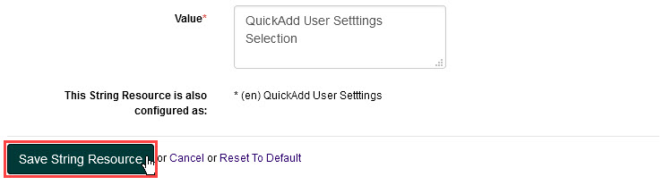 Selecting the Reset to Default option cancels out without making the change and resets the string resource back to its default value. This deletes any customised value that was assigned to the string resource.