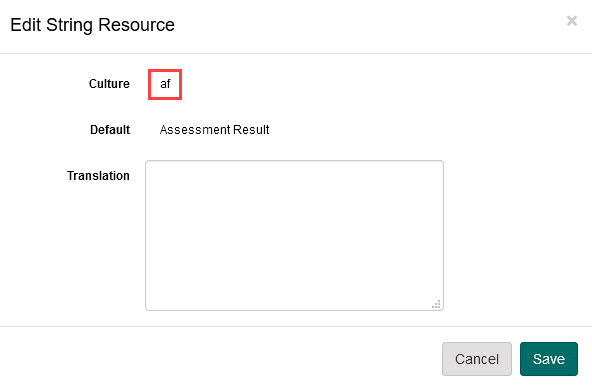 - The language you selected in the language selector will be shown in the Culture Code field on the New String Resource screen / Edit String Resource screen / Edit String Resource popup. For example: