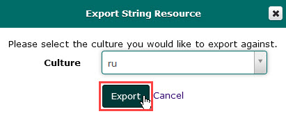 - The Export String Resource popup displays. Select the required culture/language for the string resources to export from the Culture drop-down field.