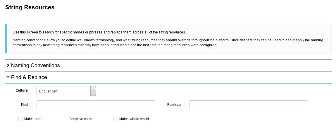 - The String Resources screen that displays can be used to search for specific names, phrases or terminology and replace these across some or all instances in Janison Insights.