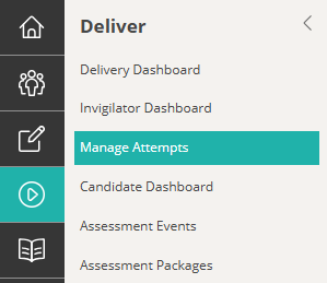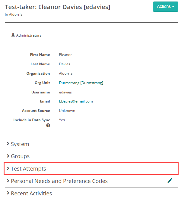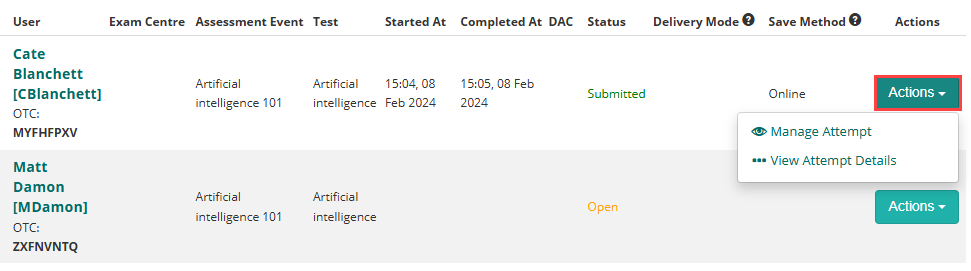 Scroll to the Test-takers section and select the Actions button for the relevant test-taker. Select Manage Attempt.