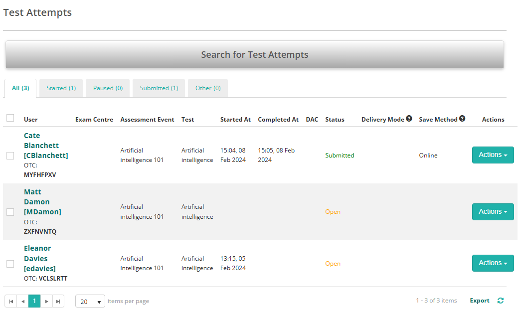The system automatically transitions a test-taker’s attempt from Open to Marking, and then to Marked, if the test is set up for automatic marking. If the test includes a human marked question such as a short answer, the attempt will remain in the Marking status until it’s manually marked. If the test has pass/fail criteria, the status will change to Passed or Failed instead of Marked.