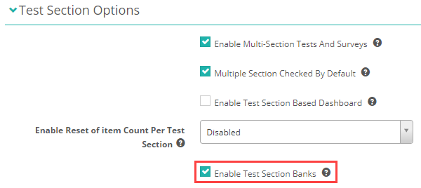 To enable test sections, navigate to Settings > Test Designer Settings and expand Test Section Options.