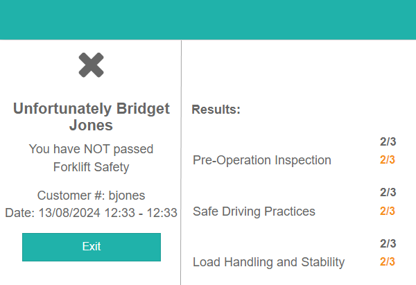 This exit type shows a not passed screen along with the results, as seen in the screen capture below. Only test-takers who fail will see the feedback screen.