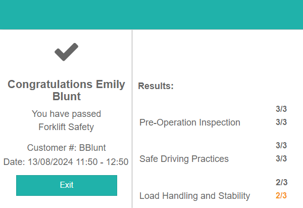 This exit type shows a passed screen along with the results, as seen in the screen capture below. Only test-takers who pass will see the feedback screen.