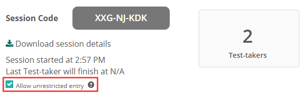 Note: If the Allow Unrestricted Entry checkbox is selected on the test sessions administration dashboard, test-takers can join the session without requiring the invigilator to admit them.