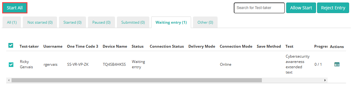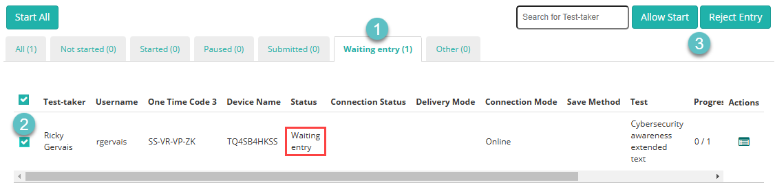 Test-takers can be viewed under the Waiting Entry tab in the Test Sessions Administration dashboard.