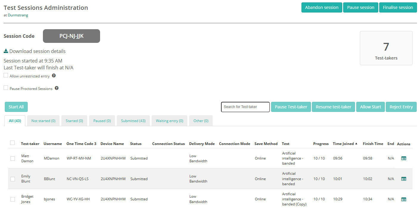| I | Test-takers details and progress | This section shows each test-taker, their one time code and their status and progress. |