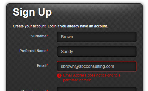 | D | Allowed Email Masks | If an email domain is entered here, Users will only be able to register if their email belongs to one of the entered domains. In the following example, ‘janison.com’ has been set as an allowed email mask, therefore the entered email doesn’t meet the requirement and the User will see a warning notification. ![]() Wildcards are permitted and are indicated with an asterisk (*), eg. ‘*.com.au’ restricts the email addresses to those that end in .com.au. |